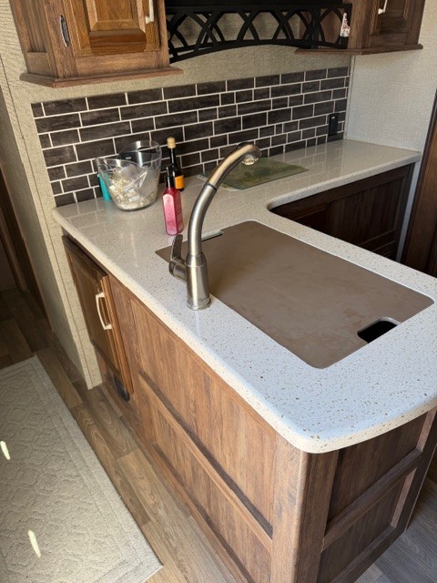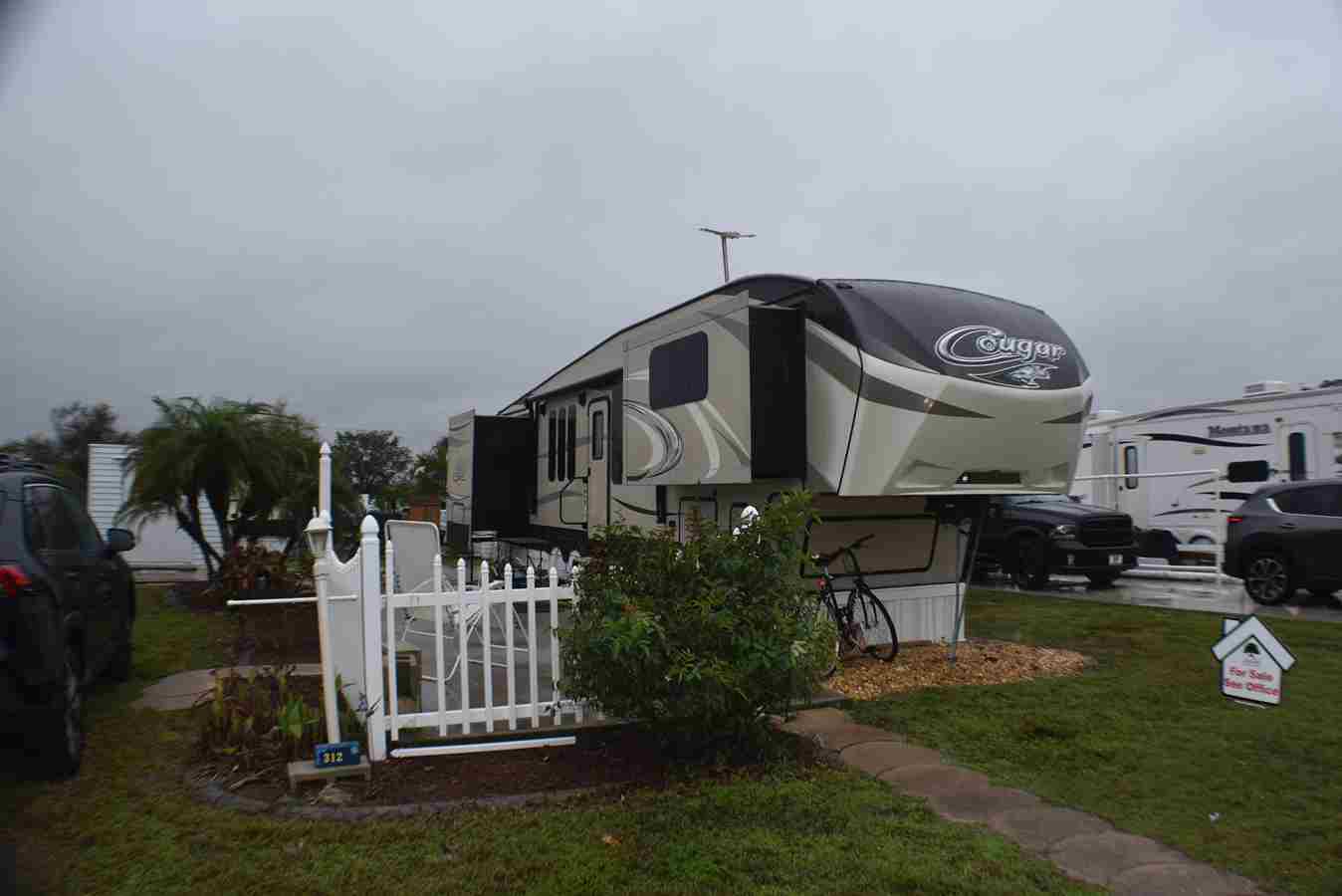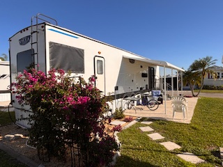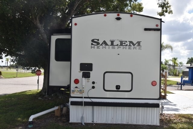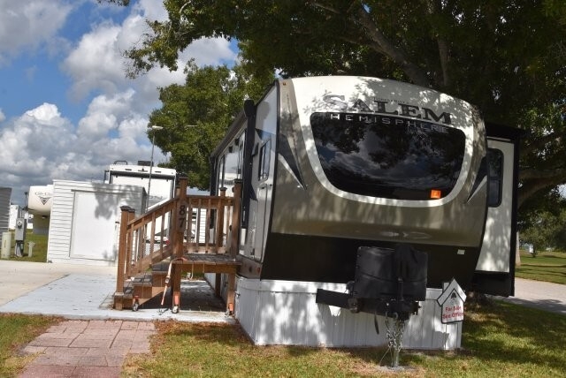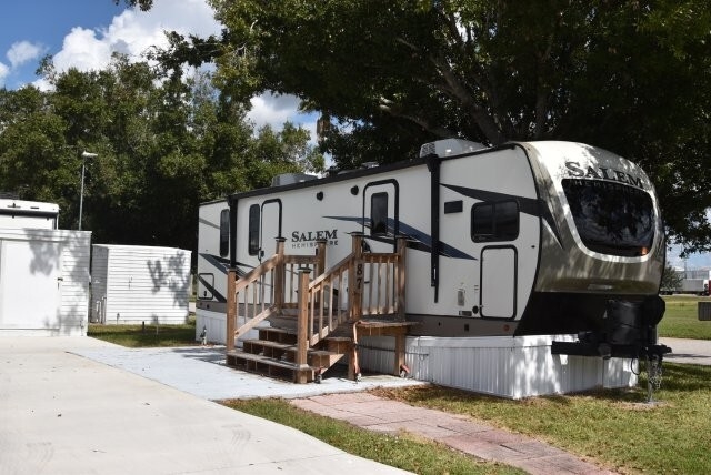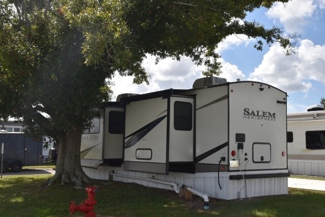 This beautifully maintained Forest River 270 FKS is already tied down and skirted at the