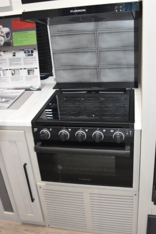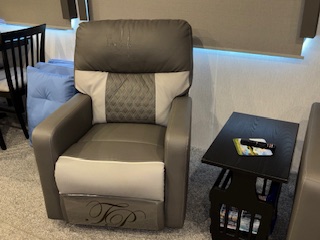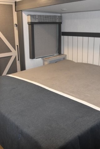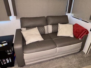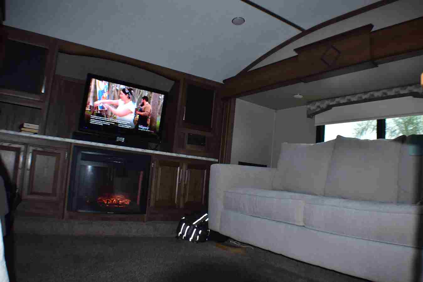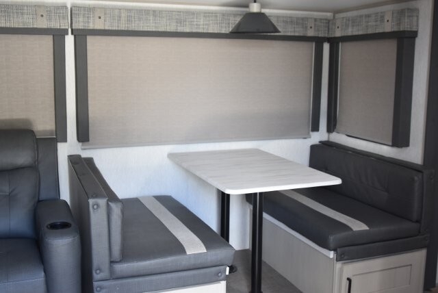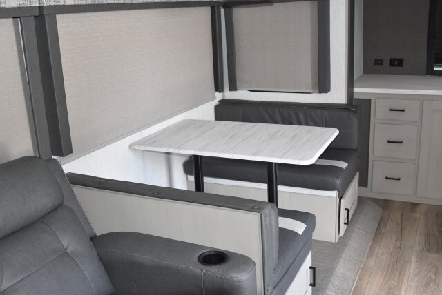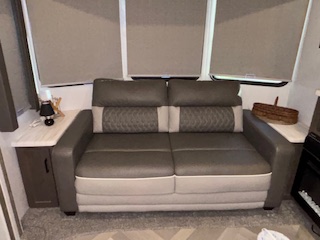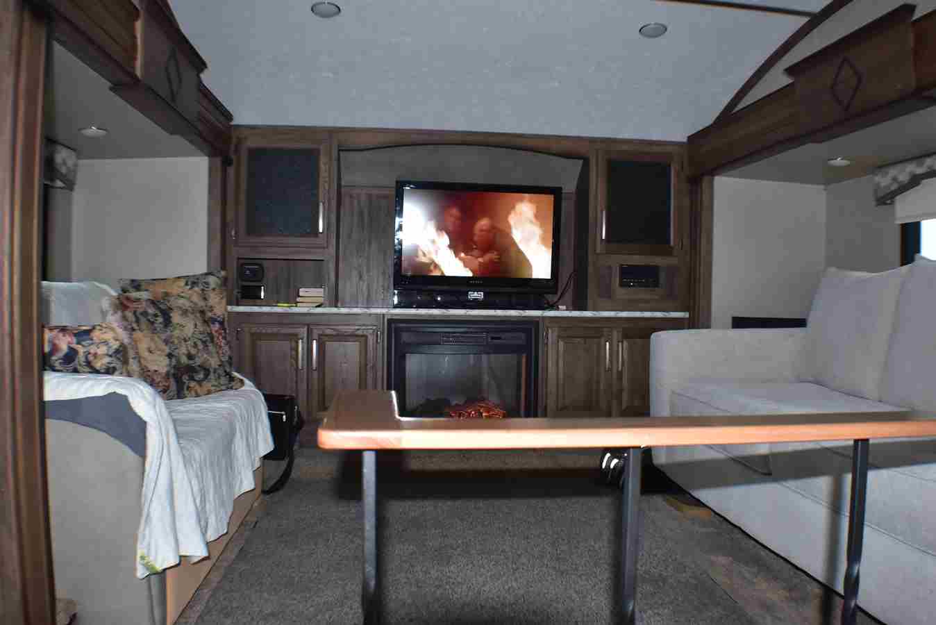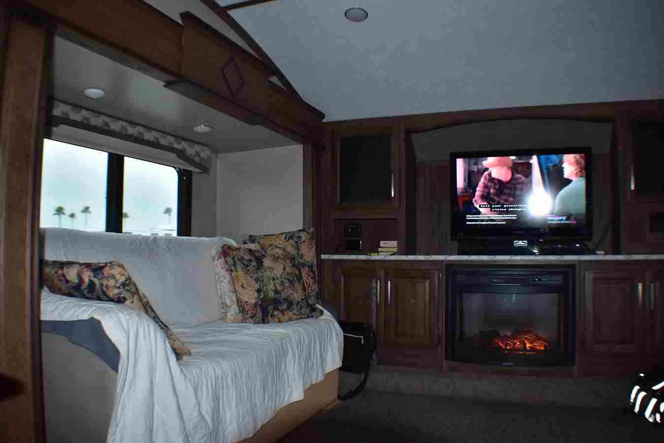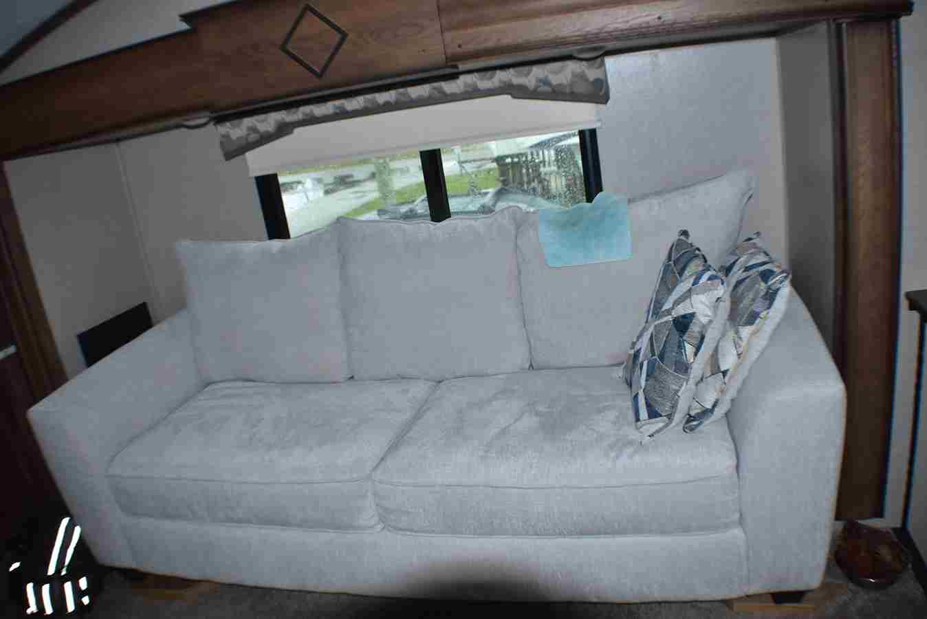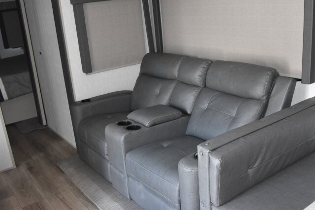 This fifth wheel features four slides. There are off-setting couches